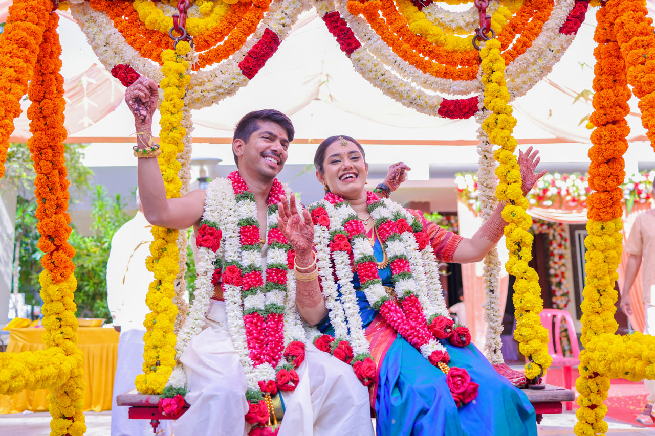 The bride and groom exchange garlands, symbolizing their acceptance of each other as life partners.